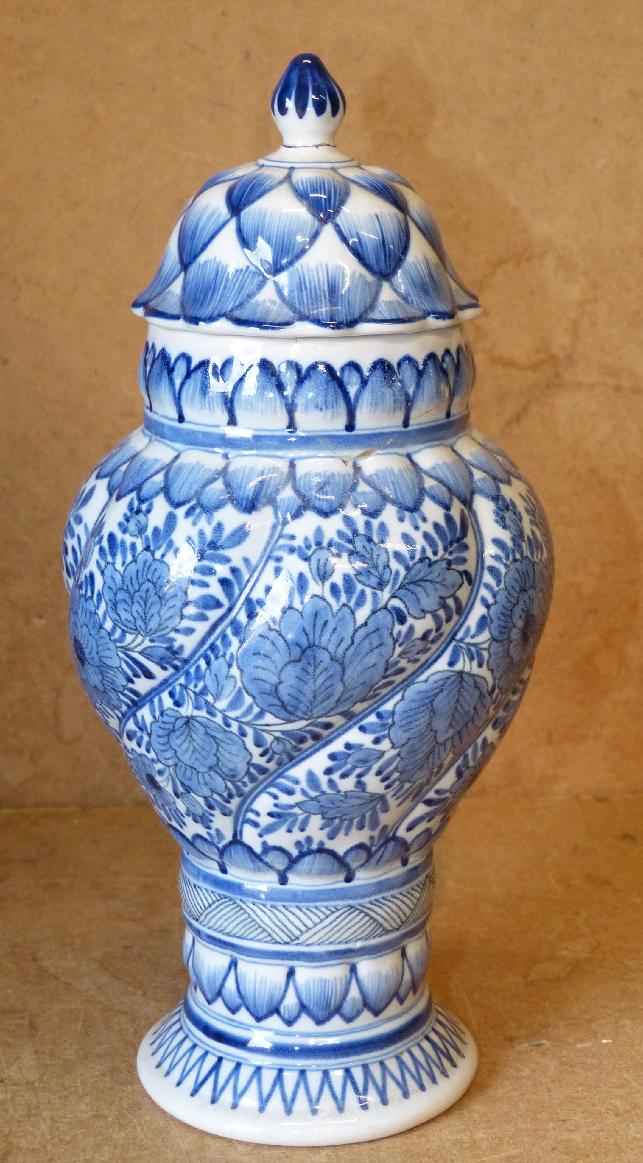 A Dutch Delft Bulbous Thin Necked Lidded Vase on blue and white ground with floral