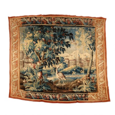 A Flemish Verdure tapestry, embroidered with bird at a lake, background with castle. 18th century. 242×258 cm.