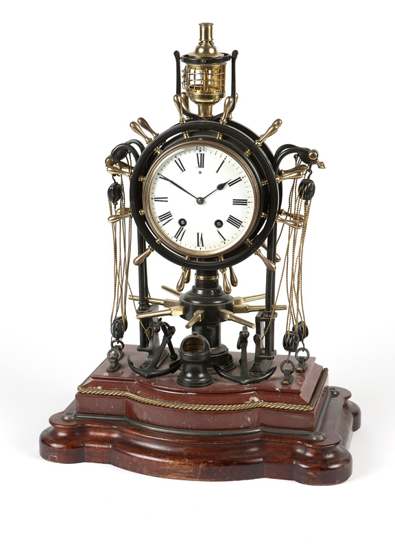 two-train movement stamped ''2349'', the circular glazed white-enameled face with black Roman numeral hour markers within a ship's wheel surround, raised on ship's rigging, the stepped red marble base further adorned with anchors and a covered compas