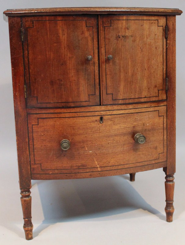 the over hanging top raised above two doors hinged doors revealing a part fitted interior with commode drawer beneath on turned cylindrical supports