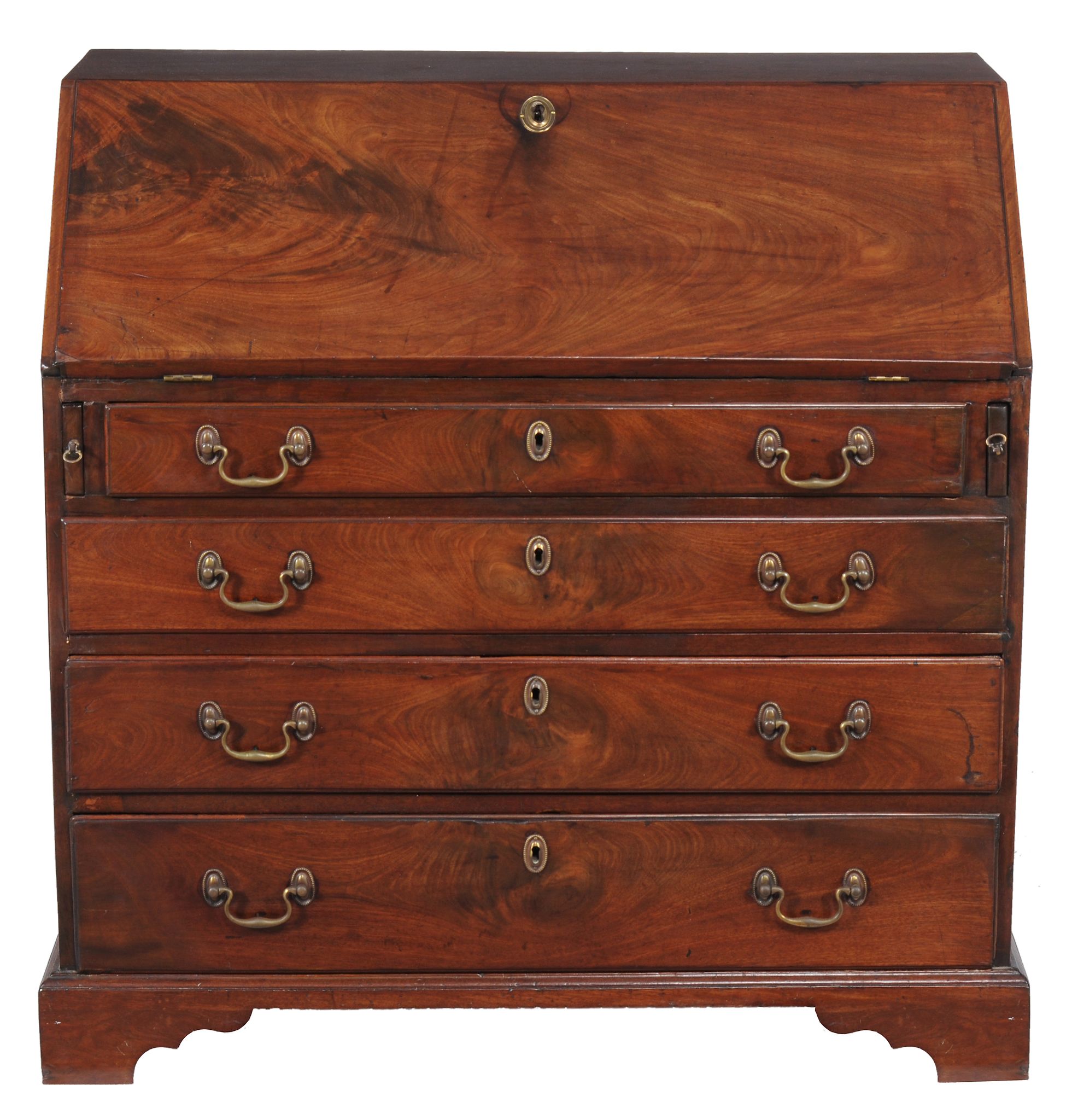 the rectangular fall opening to an arrangement of small drawers, pigeon holes and a central cupboard