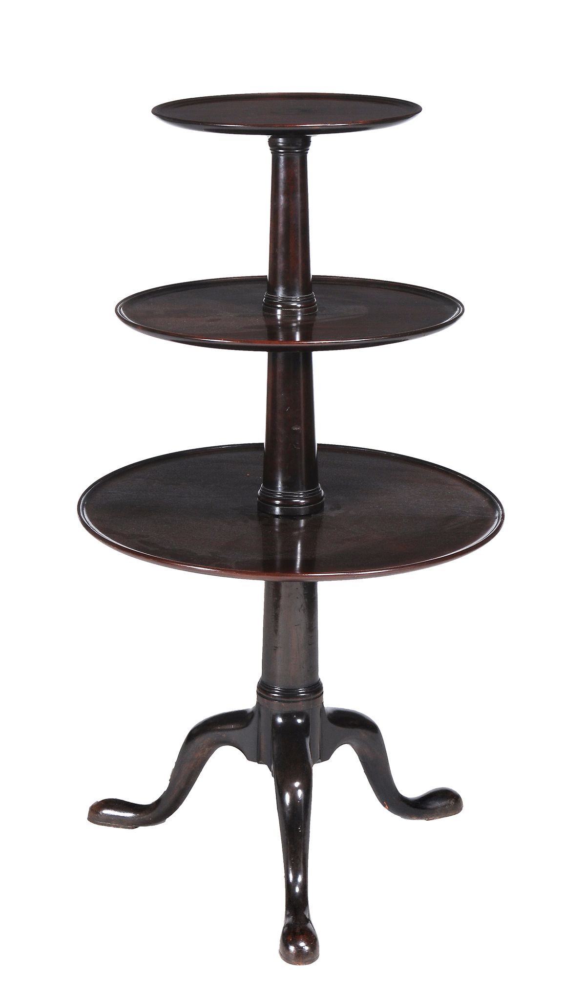 with three graduated tiers seperated by turned stems on three cabriole legs with pad feet, 116cm high, the largest tier 62cm diameter