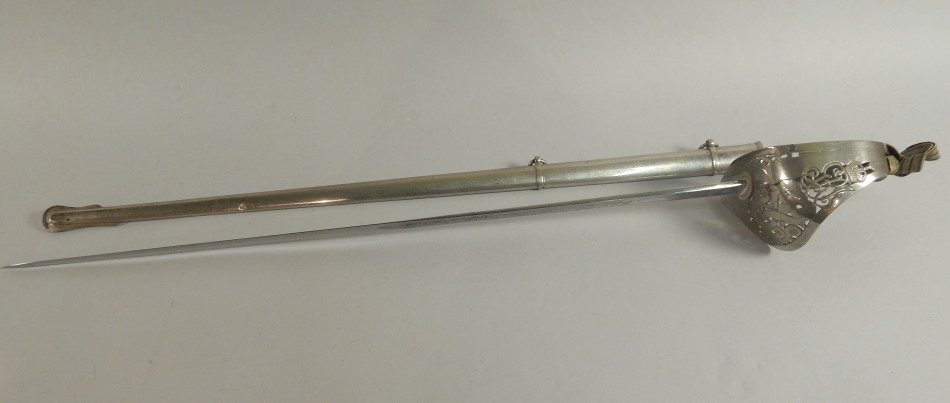with a pierced hilt, with monarchs monogram, the acid etched blade engraved J R Gaunt and Sons, London & Birmingham and with a shagreen handle