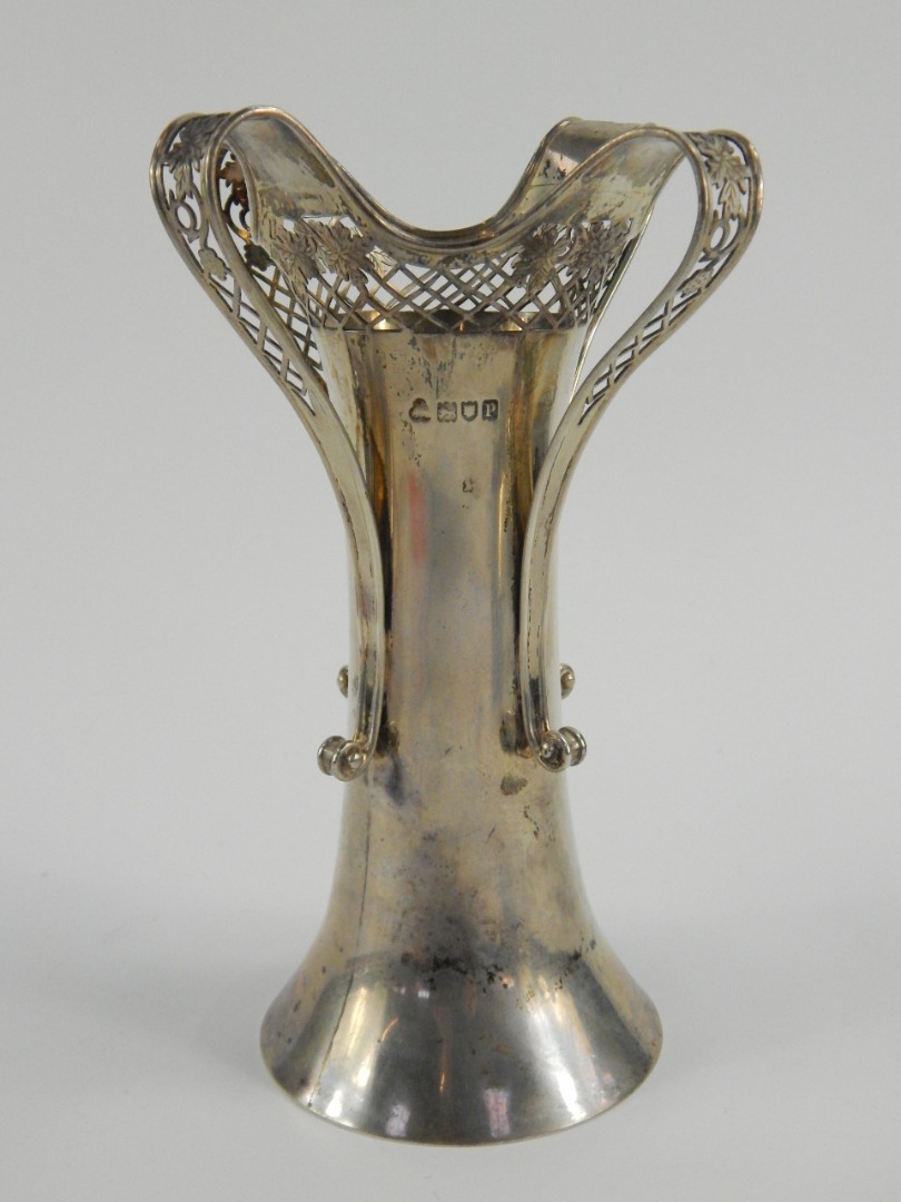 of waisted form with four pierced and scrolling handles, lattice and foliate pierced decoration, Manoah Rhodes & Son, London 1910, approx 10.2t oz