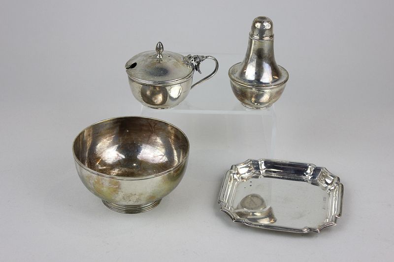 a silver mustard and pepper (a/f) and a small silver octagonal dish marked HMS Gannet, 22nd May 1972, 6.5oz