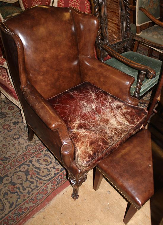 A Georgian style mahogany and brown leather wing armchair, with an associated stool