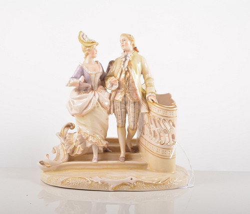 modelled as a lady and gentleman descending a staircase, oval base, stamped German 2506, 20cm