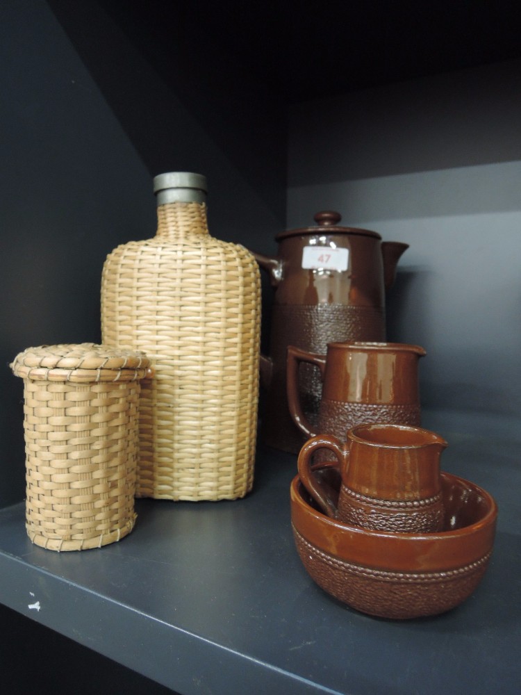 water jug, cream jug and sucre (by Gibsons) and two basket bottles