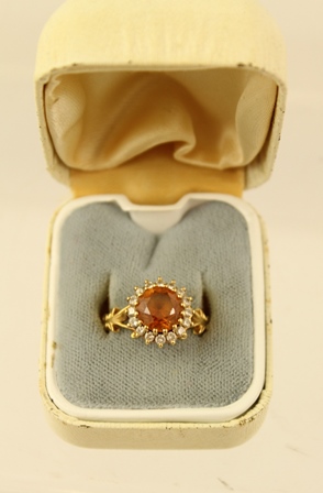 A GOLD COLOURED METAL DRESS RING set with amber tourmaline, bordered with seventeen diamonds on a fancy foliate split wire shank setting, stamped .750, size L