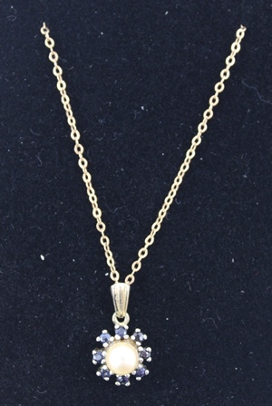 A GOLD COLOURED METAL SET PEARL AND SAPPHIRE PENDANT, having single central pearl with eight radial sapphires, on chain