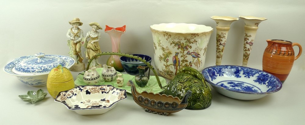 23cm, a matching jardiniere, 24 by 20cm, a pair of bisque figurines of a boy and girl, a Royal Doulton miniature jug, 7cm, a Wade leaf shaped dish and Viking boat dish, and a Beaforth tureen and cover