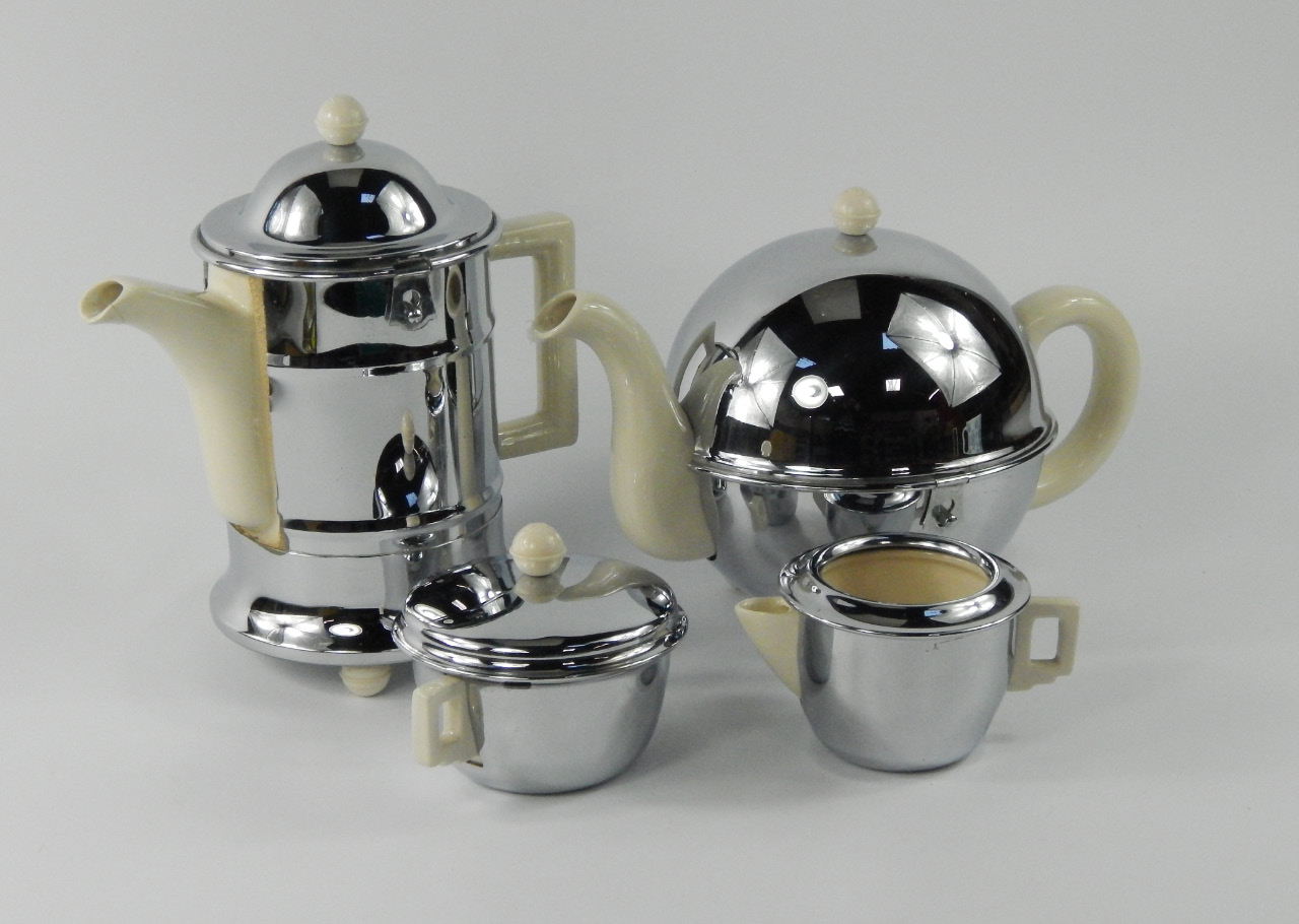 with chrome plated mounts, comprising bullet shaped teapot, a hot water jug, milk jug and two handled sugar bowl, printed marks to ceramic, impressed marks to metal with patent numbers, etc.