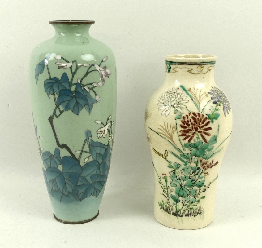 and a Japanese ceramic vase, in cream ground with floral and foliate decoration, 15cm