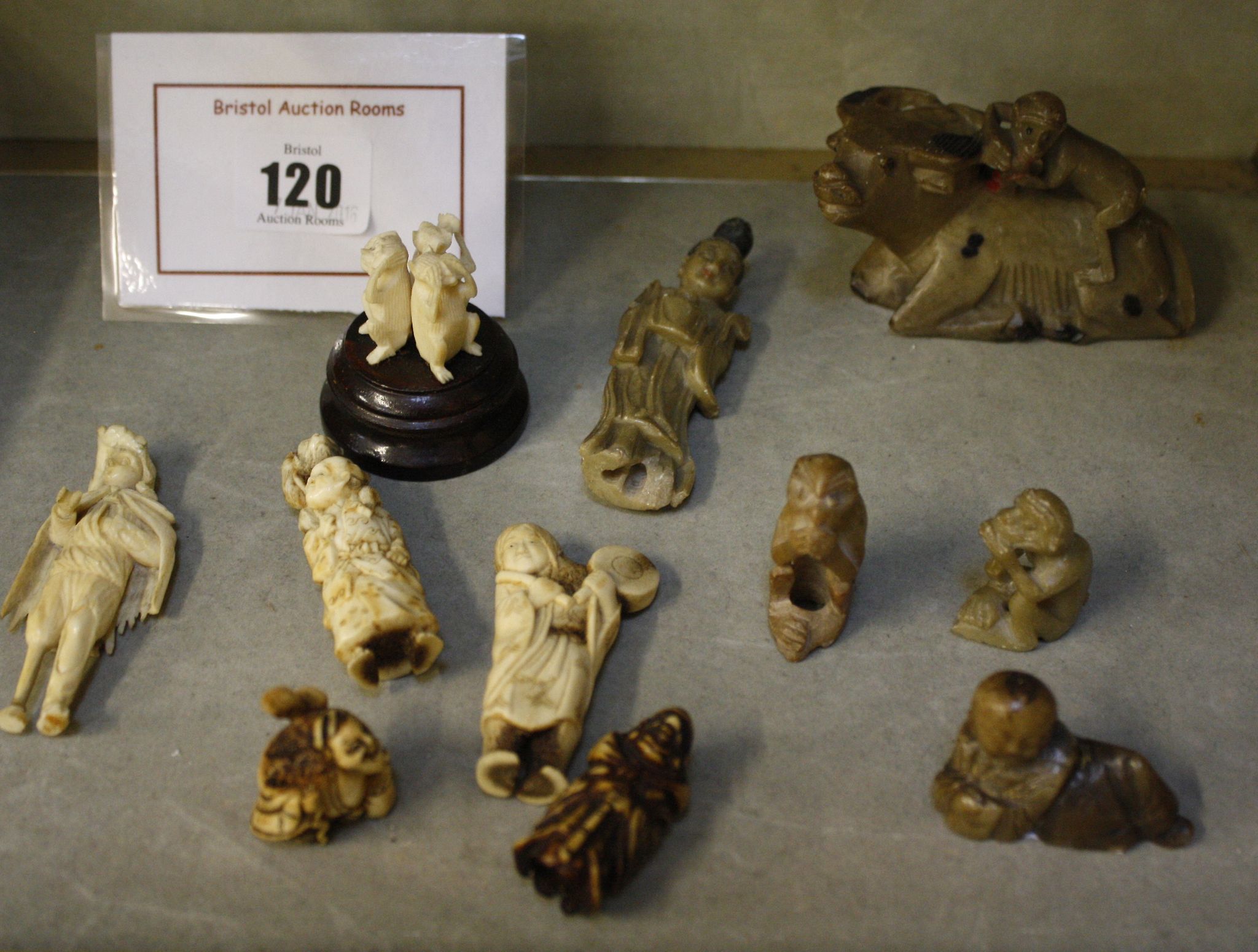 A Japanese ivory netsuke of a man with a monkey , 6cm, three other netsuke's, a soapstone netsuke of a reclining man, four other soapstone items, a Continental ivory figure of a man, 7.2cm (af) and a 'see no evil' group mounted on a wooden stand (glu