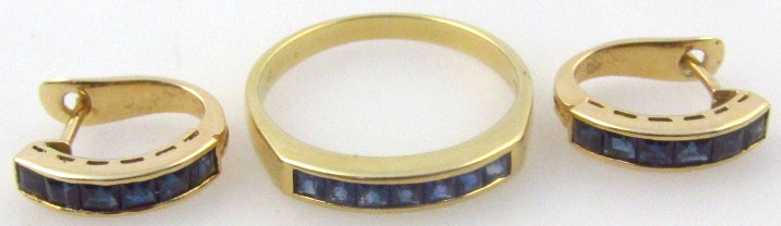 comprising ring, size O and ear studs set with blue stones, yellow metal marked 750, 5.5g all in. (3)