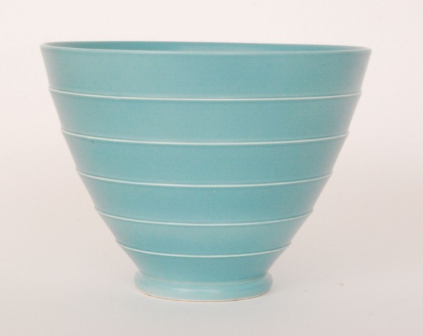 A Keith Murray for Wedgwood vase of flared form decorated in a matt blue glaze with carved horizontal bands, printed Etruria & Barlastone mark, height 14cm