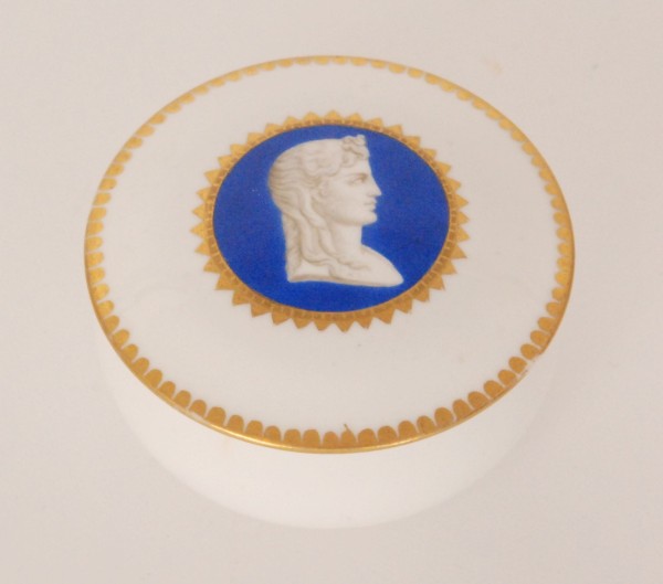 A Kerr and Binns, Worcester rouge pot and cover decorated with a classical portrait in profile against a blue ground with a gilt border edge, marked to the lid underside, diameter 6cm, S/D