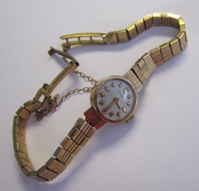 A Lady's Rolex Wristwatch the circular champagne dial with hourly markers in 9ct gold case on integral graduated flexible link b