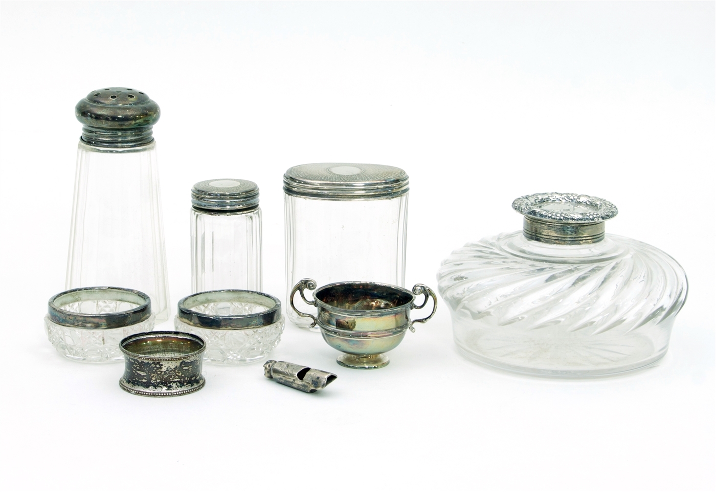 and hinged silver cover, various glass jars with silver covers, a whistle, etc.