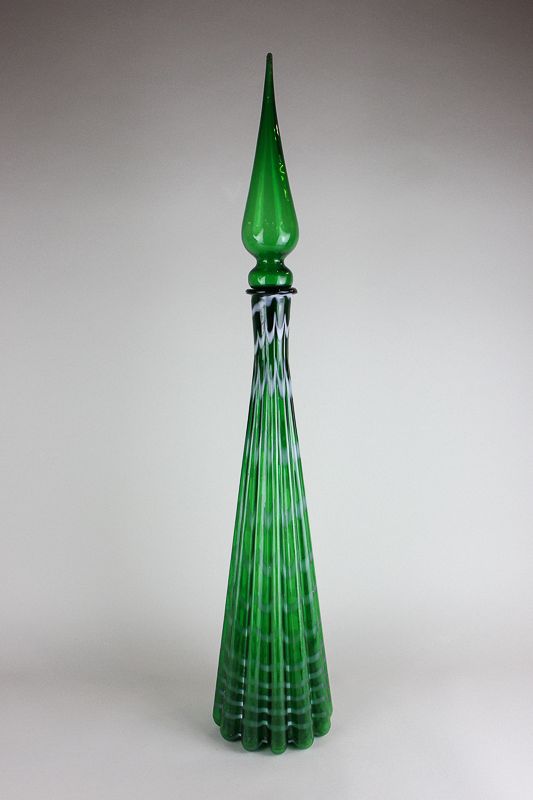 A large green glass Montrose decorative bottle with stopper, with white waved design, Montrose made in Italy sticker to base, 75cm high
