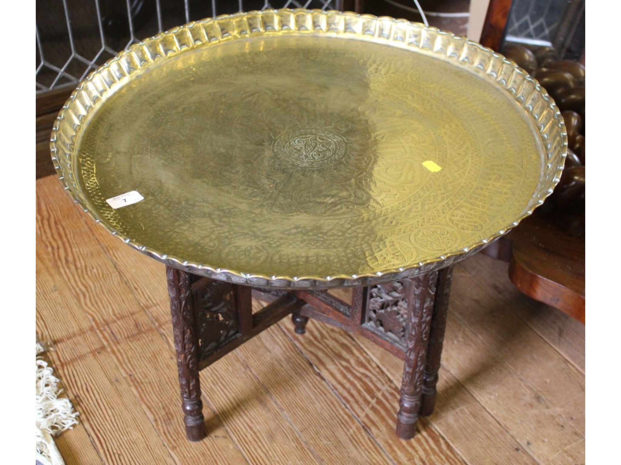 A large Indian brass tray on folding wood stand