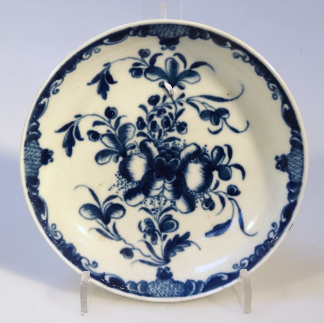A late 18thC Dr Wall period Worcester blue and white saucer, decorated with flowers with an outer floral and geometric banding, full blue crescent mark verso, 12cm dia.