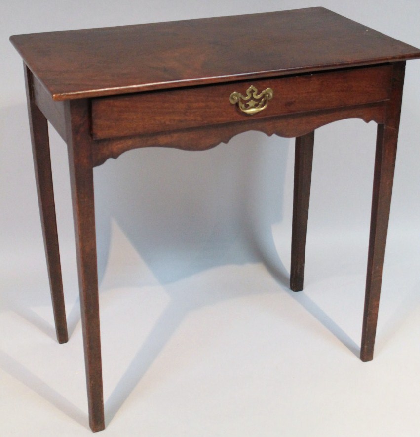 the rectangular over hanging top raised above a single drawer with elaborate back plate and swan neck handles, above a carved frieze, the whole raised on square tapering supports