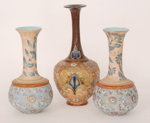 A late 19th Century Doulton Slaters Patent Chine ware vase of globe and shaft form, the body decorated with a tubelined floral motif against a patterned ground, impressed marks, height 40cm together with a pair of Doulton Slaters Patent Chine ware va