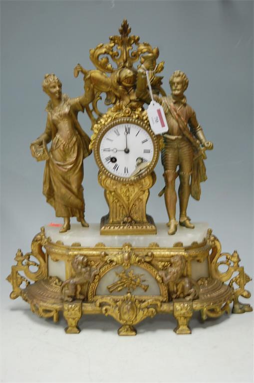 A late 19th century spelter and onyx figural mantel clock