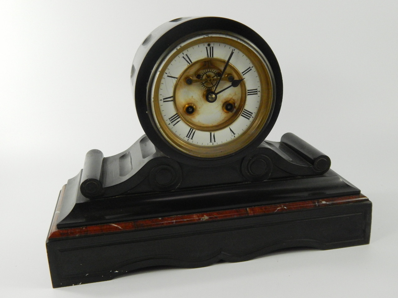 A late 19thC French black slate and marble drum shaped mantel clock