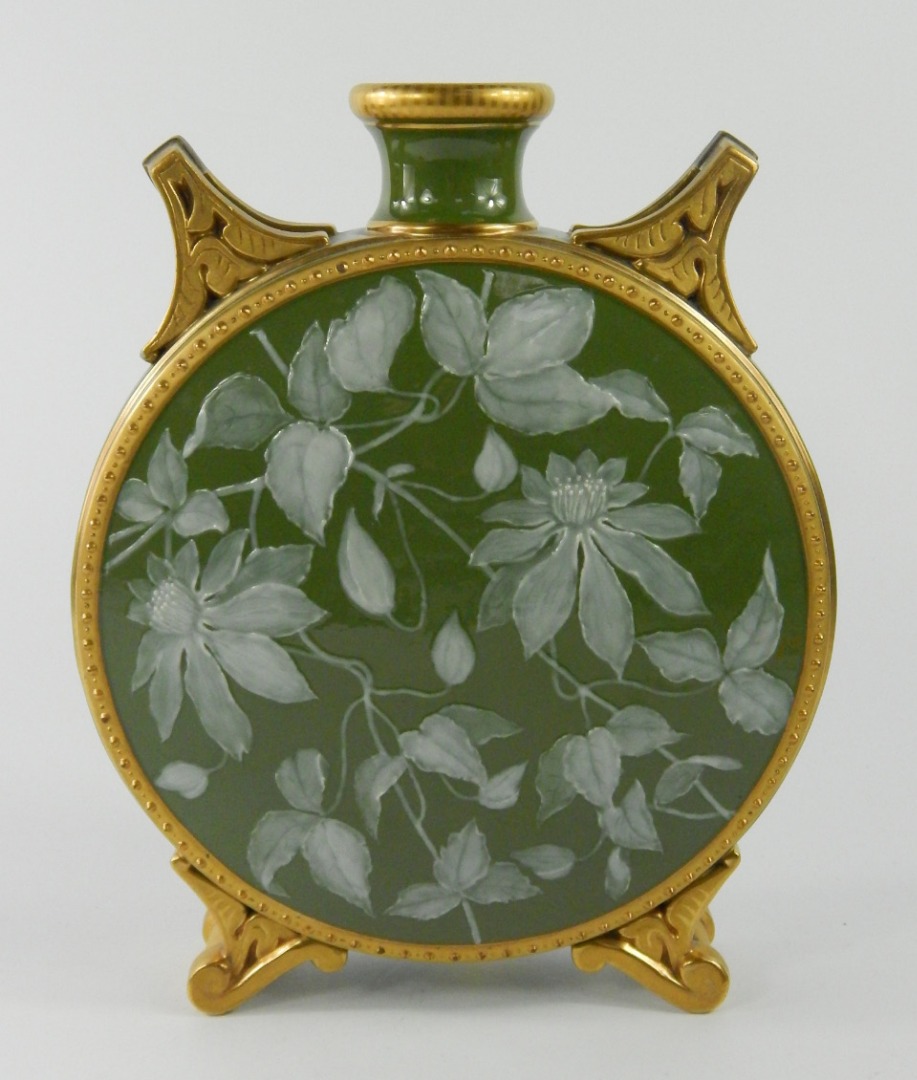 decorated with pate-sur-pate type decoration with white flowers on a dark green ground within gilt borders