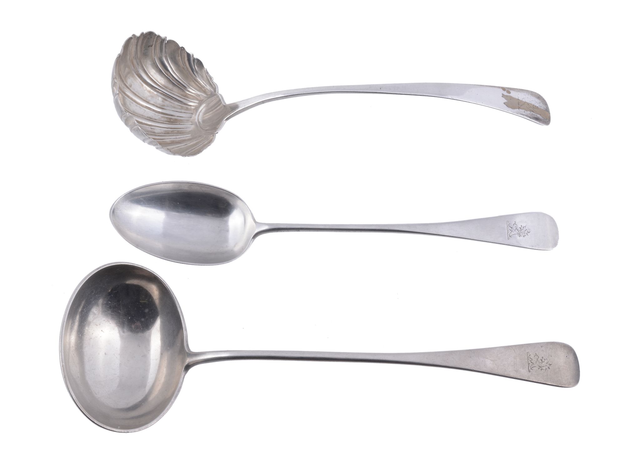 by Josiah Williams & Co. of Bristol, London 1890, engraved with a crest, the spoon 30.5cm (12in) long; and a George III old English feather edge shell bowl soup ladle by Jacob Marsh or John Moore, London 1774, engraved with a worn crest, 593g (19.05