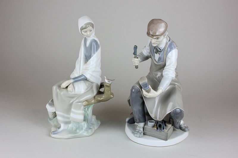 A Lladro porcelain figure of a cobbler, 25cm, together with a Lladro figure of a woman seated on a branch looking at a bird, 24c