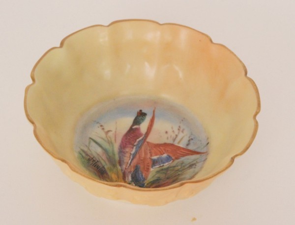 A Locke & Co, Worcester shallow bowl decorated by W. Stinton with a hand painted mallard about to take flight amidst grasses, signed, green printed mark, diameter 12cm.