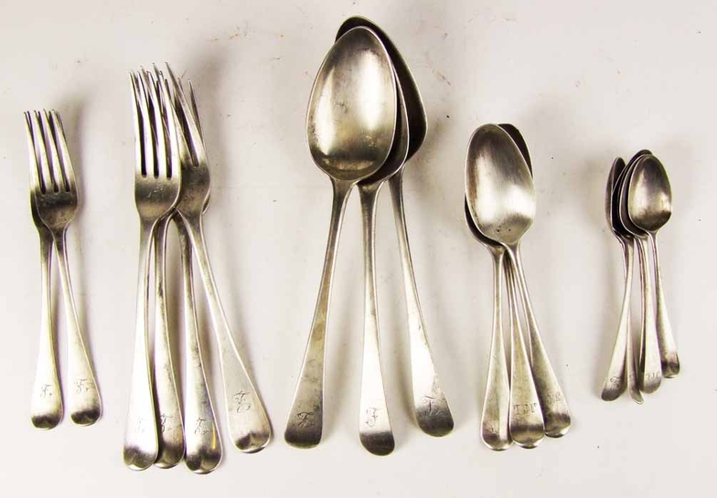 comprising four table forks, two dessert forks, three dessert spoons, three table spoons, and five tea/coffee spoons, various dates and makers, George III to George V, total approx