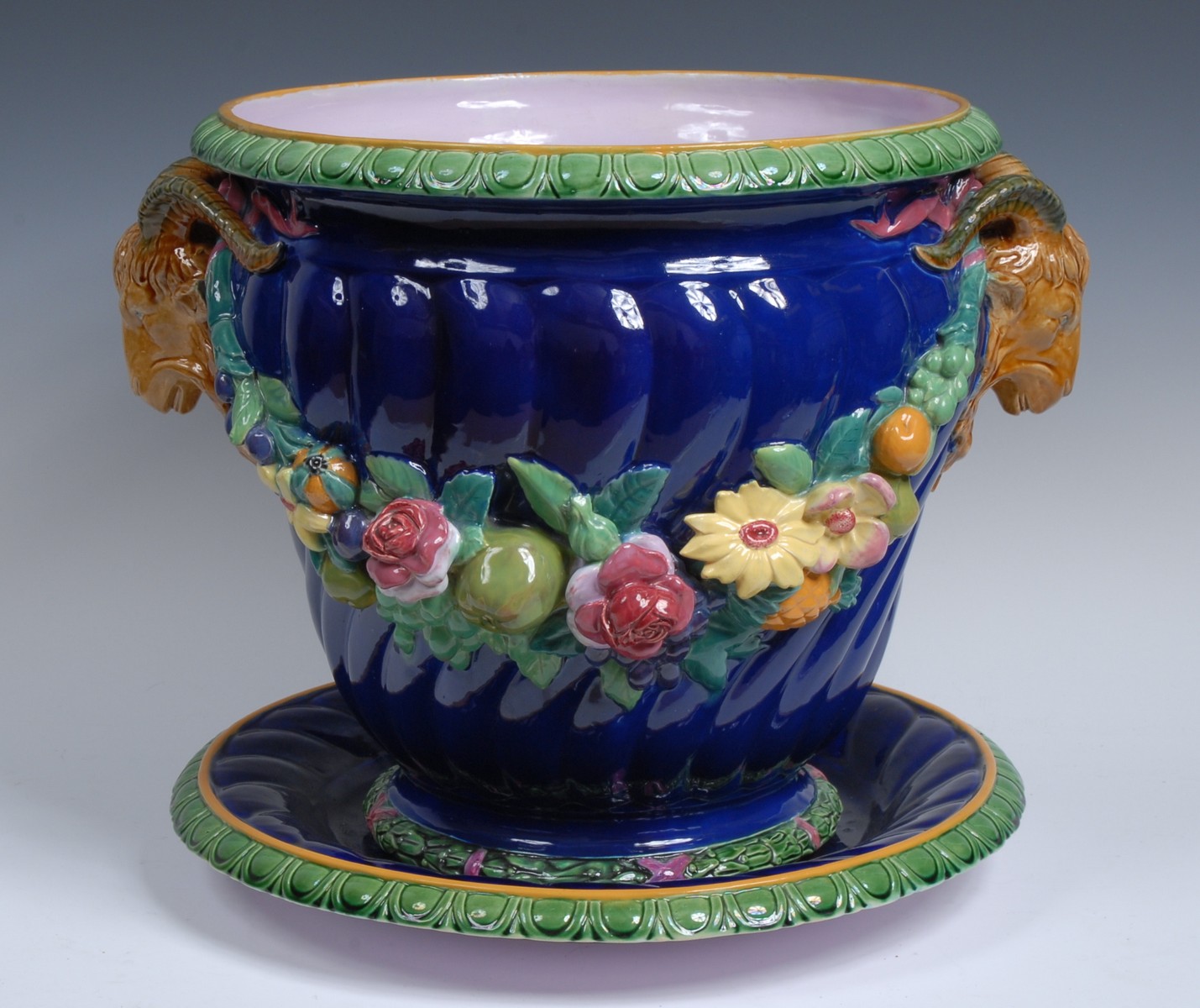 Minton majolica wrythen moulded jardiniere on stand, the interior in lilac, the exterior with ribbon tied floral swags, ram's head handles, in ... colours on a cobalt blue ground, tied laurel leaf border, 36.5cm high,impressed marks, shape no.727