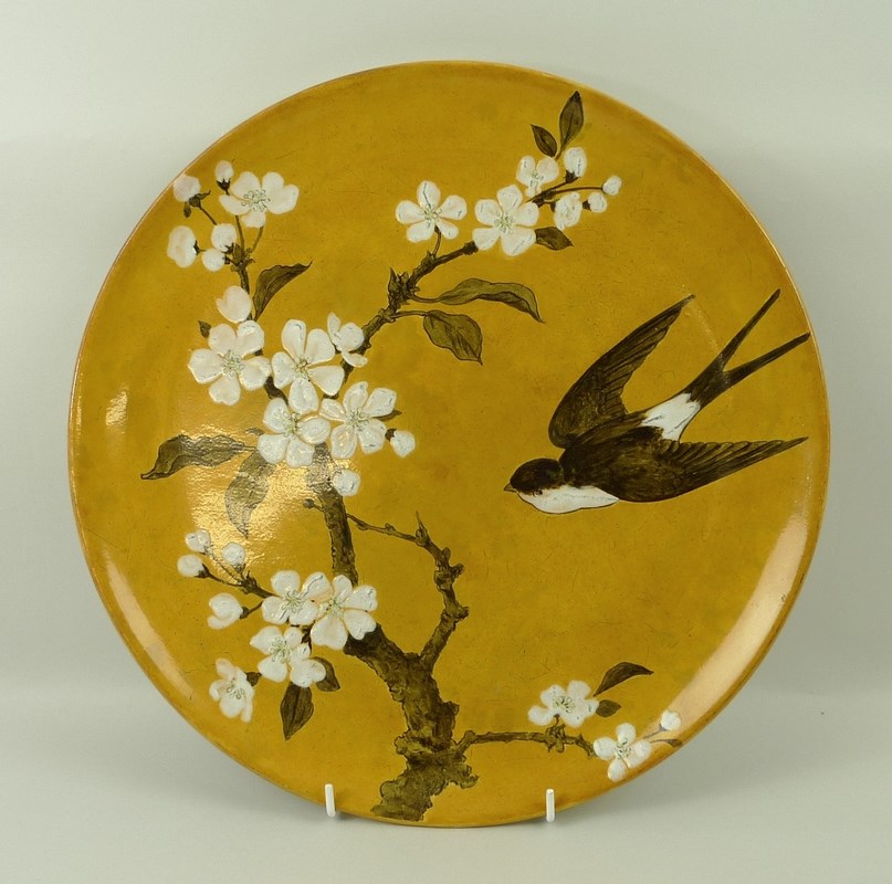 A Mintons charger, decorated with white blossom and a swallow on a mustard coloured ground, stamped to base Minton's Art-Pottery Studio Kensington Gore', and impressed marks, 34cm diameter.