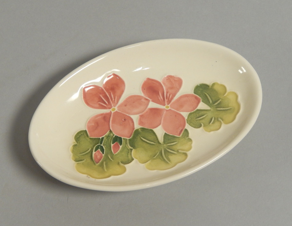 A modern Moorcroft Geranium pattern oval pin tray or dish