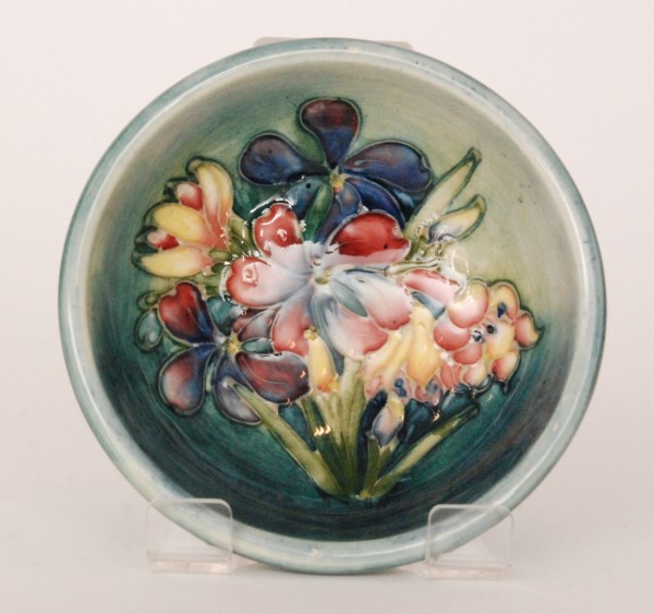 A Moorcroft footed bowl decorated in the Spring Flowers pattern with a tubelined bouquet of flowers against a green wash ground, impressed marks, diameter 11.5cm