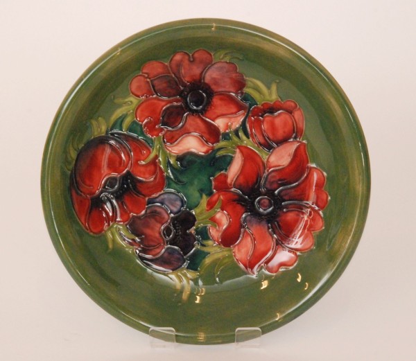 A Moorcroft shallow plate decorated in the Anemone pattern with tubelined flowers and foliage to a green ground, impressed marks, diameter 21.5cm