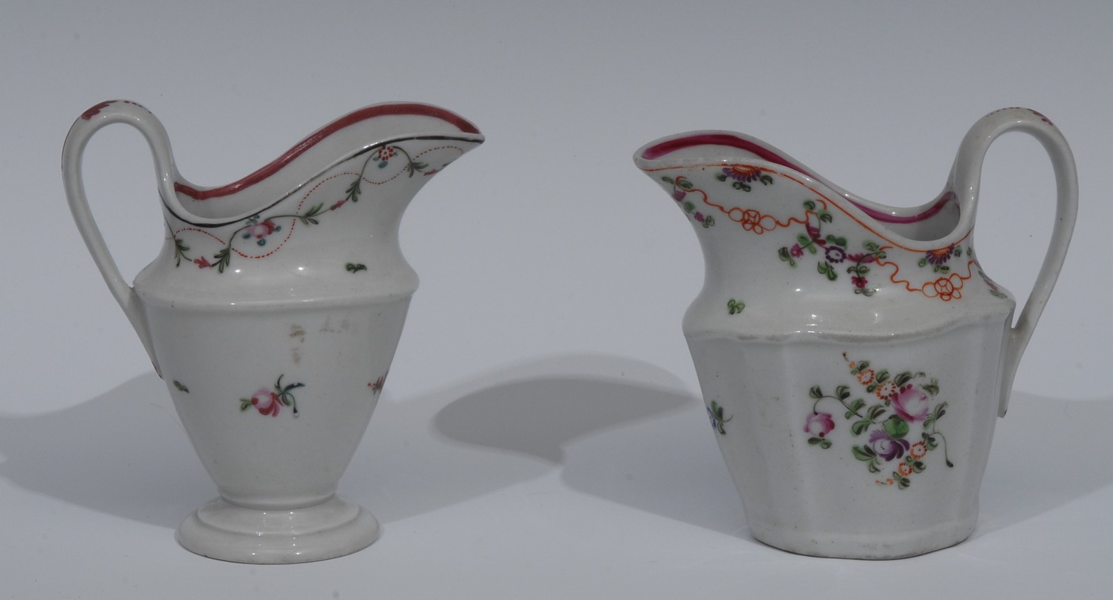 A Newhall silver shaped cream jug, pattern 195, decorated with stylised roses and foliage, the border with ribbon tied foliate swags, the interior ... with puce line border, 10.5cm high, c.1800; another, helmet shaped, pattern N241