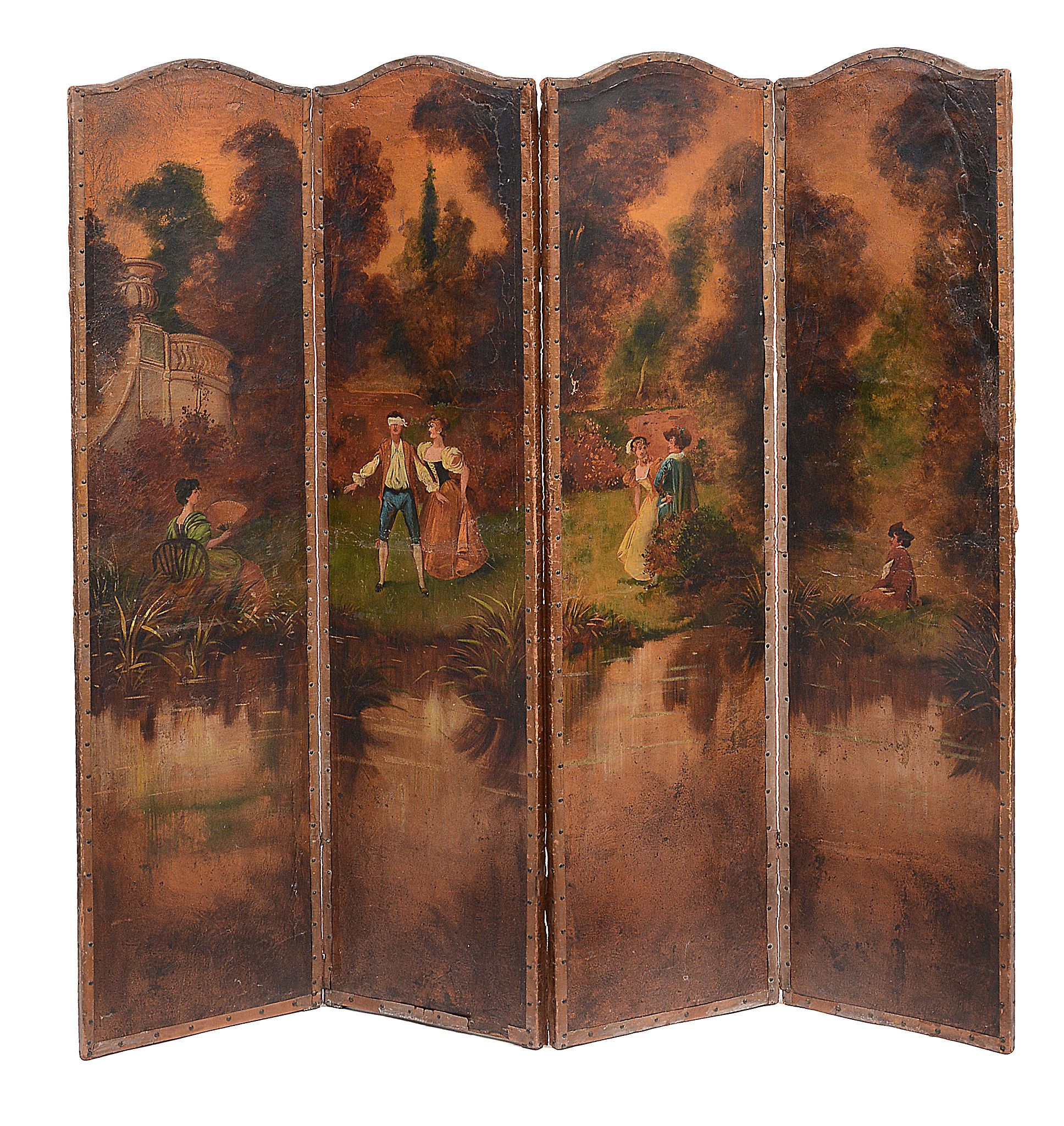 each panel painted with a couple in a landscape, the reverse painted to simulate panelling