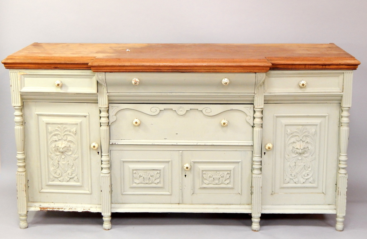 with one cushion above one long drawer and a cupboard, flanked by two frieze drawers above cupboards, raised on turned feet