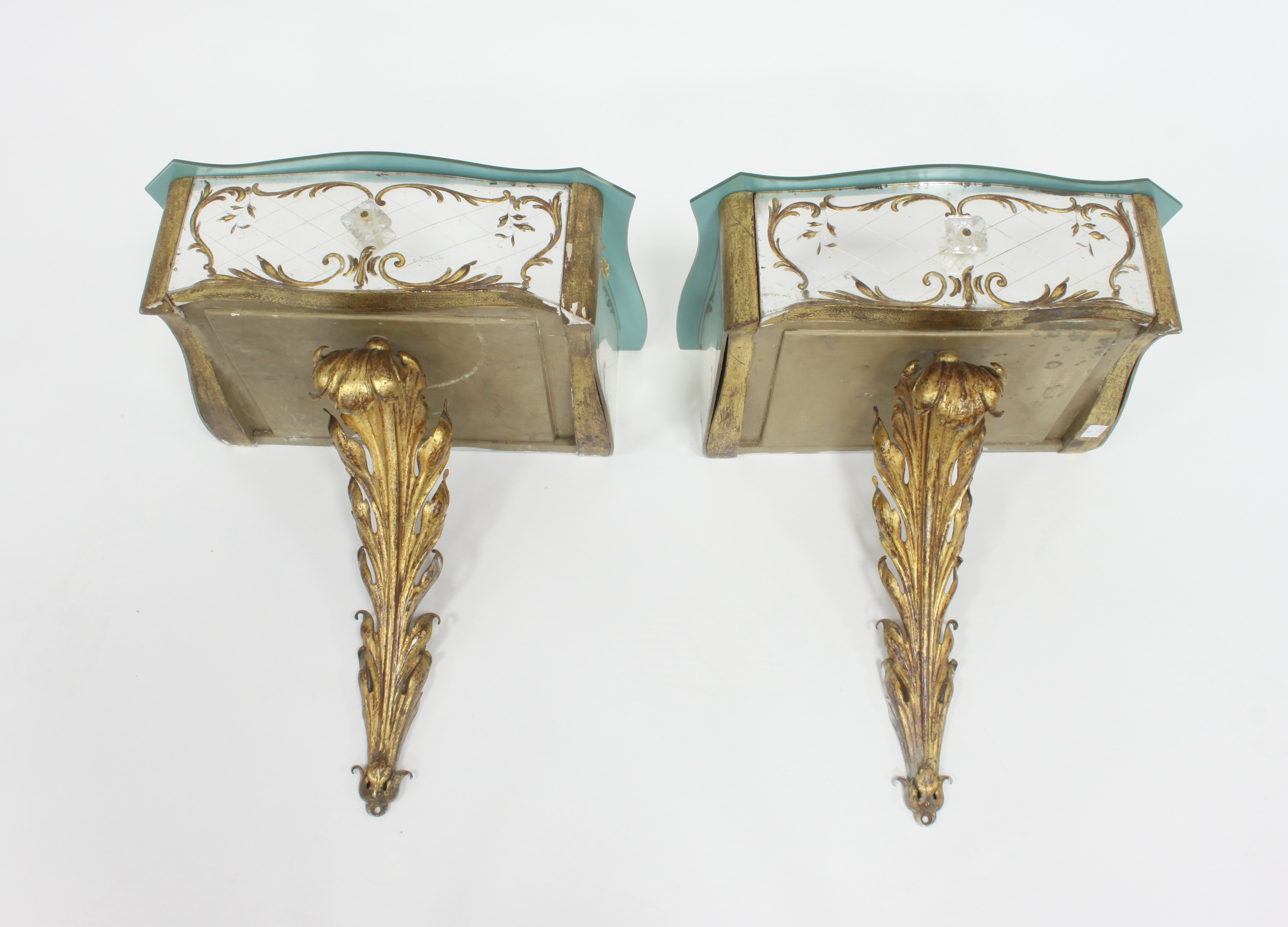A pair of 20th Century mirrored console tables on leaf chased supports