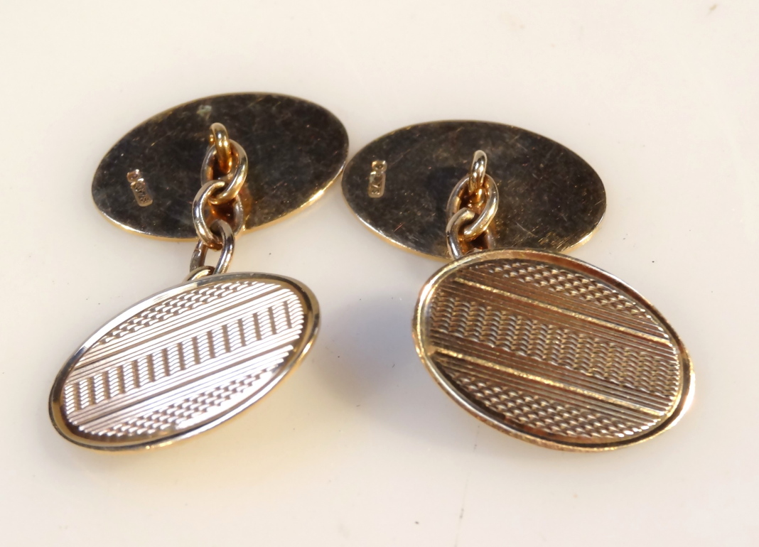 A pair of 9ct gold cufflinks, each with engine turned ovals joined by link chain centres, 2cm high, 5.5g in fitted case.