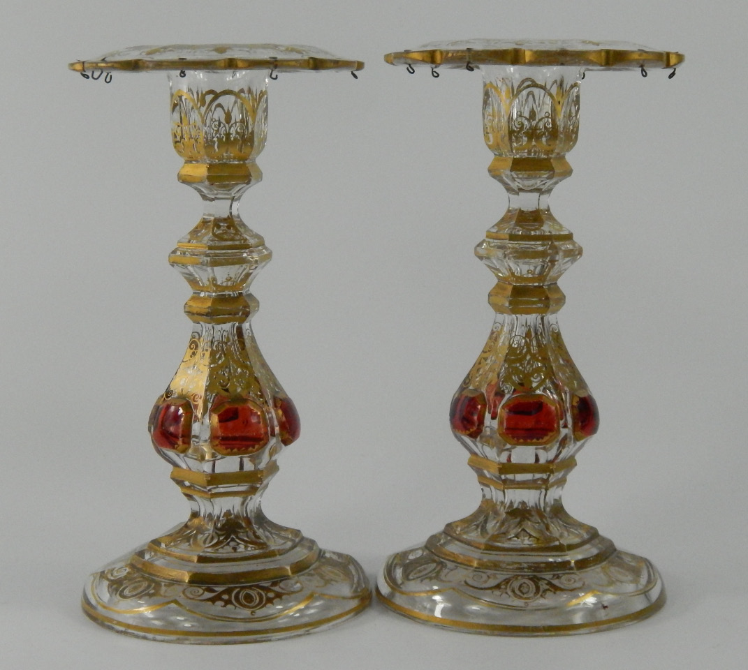 each with a knop stem picked out in gilt on a domed foot, lacking oil lustre drops