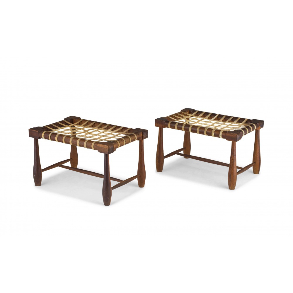 each rectangular, with riempie seat, on baluster legs joined by an H-stretcher, 36cm high, 61cm wide, 39,2cm deep