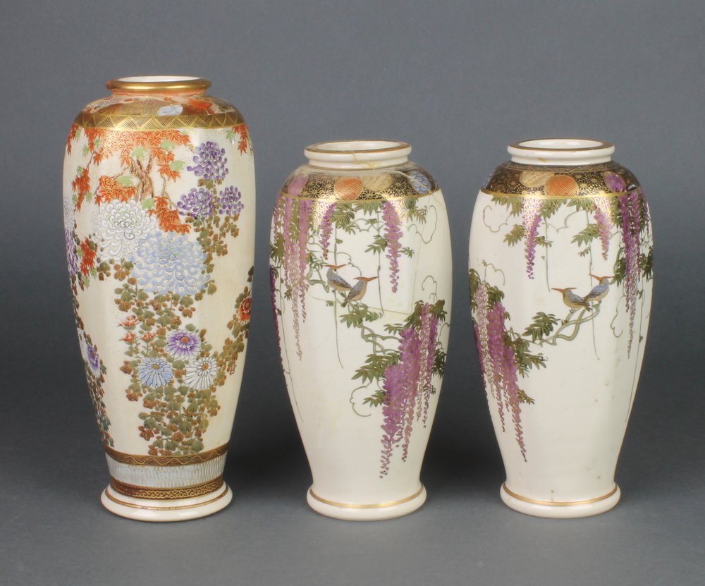 A pair of early 20th Century hexagonal Satsuma vases decorated with exotic birds and trailing wisteria 7", a larger ditto decorated with peony 9"