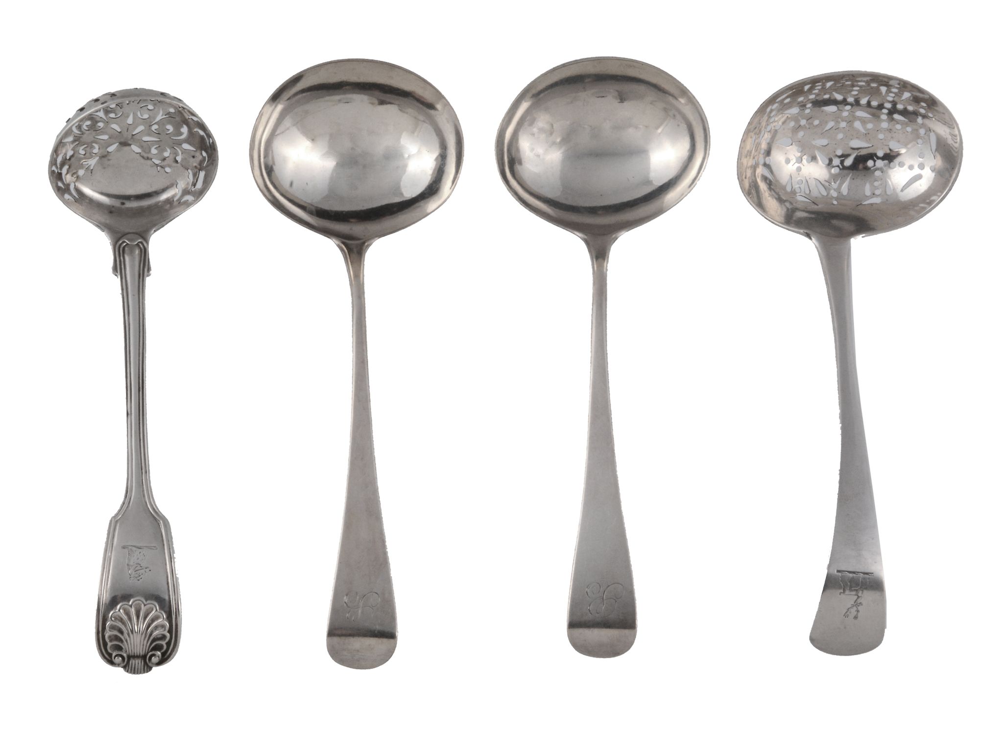 by Solomon Hougham, London 1804, engraved with a script B ; an old English sugar sifting spoon by William Welch II, Exeter 1816, engraved with a crest; and an early Victorian fiddle, thread and shell pattern sifting spoon by Mary Chawner, London 1838