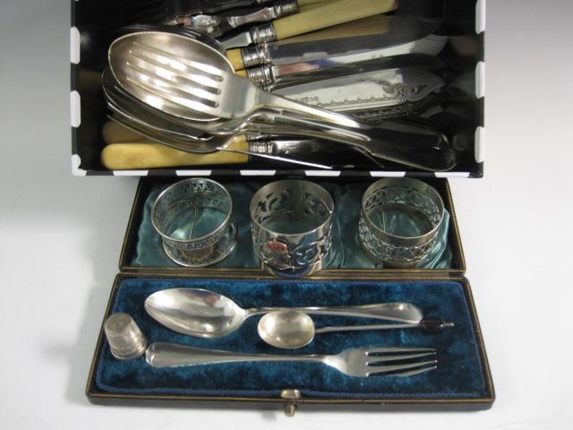 A pair of George III silver Table Spoons old english pattern, London 1788, six silver hafted Tea Knives in case, Thimble, bean handled Spoon, sundry plated Cutlery and Napkin Ring